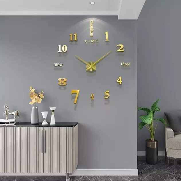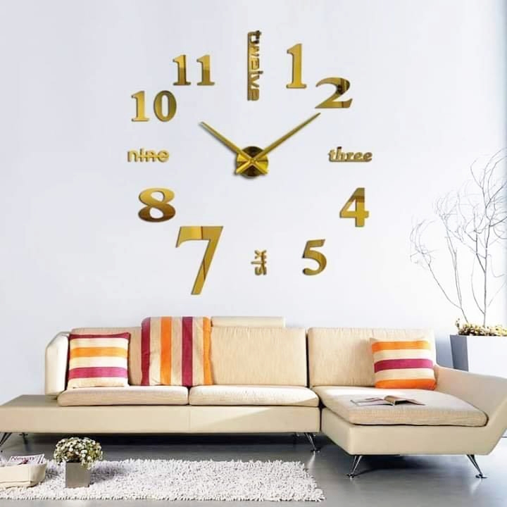 Description : Type : Horloge murale - Forme : Rond - Matière : Acrylique - Style : 3D - Caractéristique : les chiffres et les numéros sont Autocollants - La boite de montre est aussi autocollant - Type de pile : AA ( cigarette ) - Longueur d'Aiguille : 10 & 14 cm - Nombre d'aiguille : 2 - Diamètre : approximativement entre 120 et 160 cm ( ajustable selon les besoins )